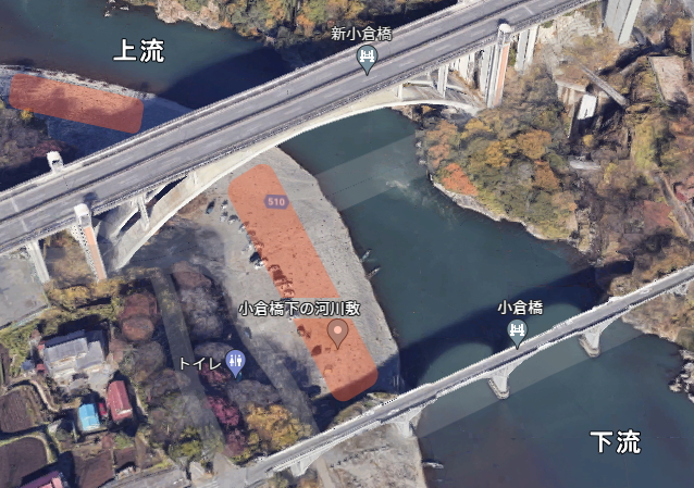 「小倉橋河川敷」では基本的に赤いエリアに設営が可能です。